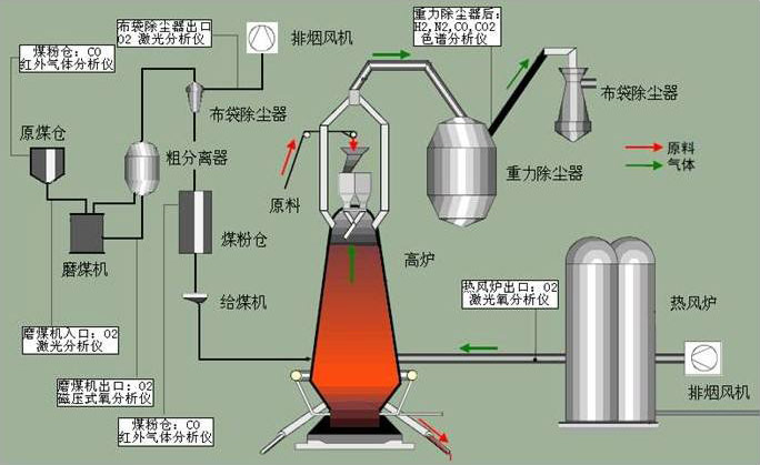 高爐煤氣是高爐煉鐵過程中所得到的一種副產品,其主要成分CO,?CO2?,?N2?,?H2?,CH4等,?屬于重要的二次能源。 針對噴煤中煙煤的易揮發性、強爆炸性,國惠激光氣體分析儀可在線實時監測高爐爐氣中的多氣體組分,指導高爐安全生產,優化工藝,降低生產成本;?