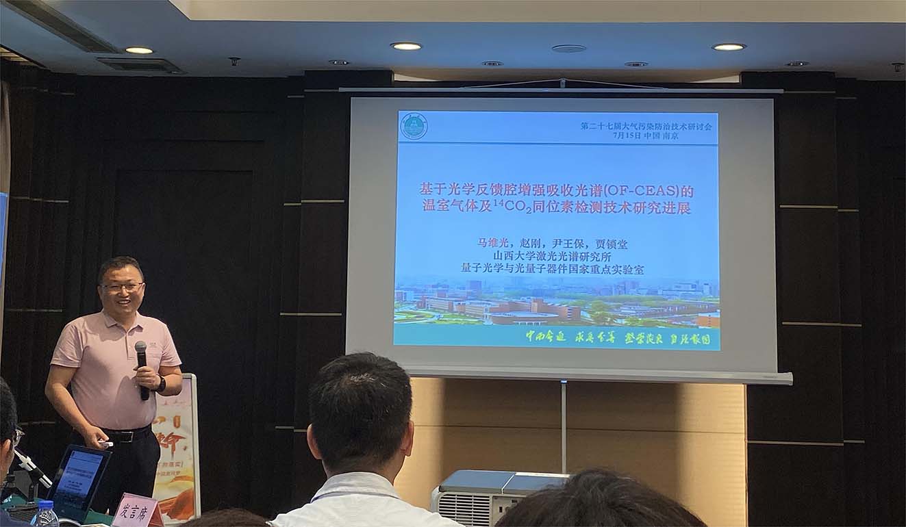 山西大學量子光學與光量子器件國家重點實驗室、山西國惠華光碳監測技術負責人馬維光教授受邀參與了此次會議,馬教授就“基于光學反饋腔增強吸收光譜的溫室氣體及 14CO2 同位素檢測技術研究進展”的主題進行了學術報告。發言中,馬教授結合雙碳目標和我國生態環境碳監測政策的研究背景,分析報告了“激光吸收光譜技術”、“光學反饋腔增強激光吸收光譜技術”、“高精度CO2、 CH4檢測技術 ”和“14CO2激光檢測技術”多項技術,探討了我國在溫室氣體監測技術領域的發展現狀與挑戰,對未來我國碳監測工作部署提出了意見建議。